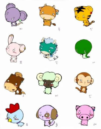 자-쥐, 축-소, 인-호랑이, 묘-토끼, 진-용, 사-뱀, 오-말, 미-양, 신-원숭이, 유-닭, 술-개, 해-돼지의 순서로 이루어집니다.