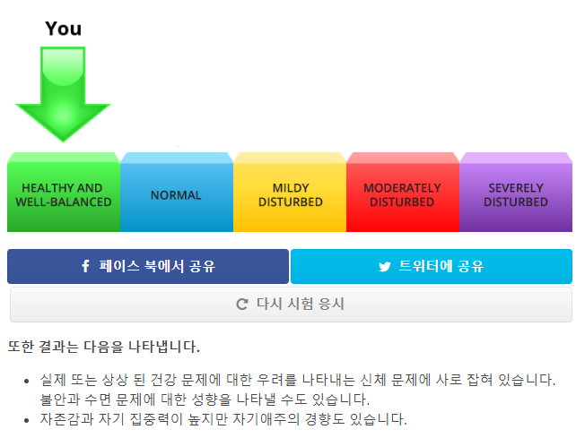 필자의 경우 이미지 심리테스트를 통해서 Healthy and well-balanced의 결과를 받았습니다.