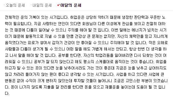 첫번째는 네이버 생년월일 운세다. 전체적으로 운의 기복이 있다고 한다. 취업운이 상당히 약하다고하고, 또한 무리하게 활동을 하지 말라고한다. 또  전반적으로 모든 운이 없다고 나온다. 참고로 네이버는 오늘 / 내일 / 이달의 운세 3가지만 조회가 가능했다.