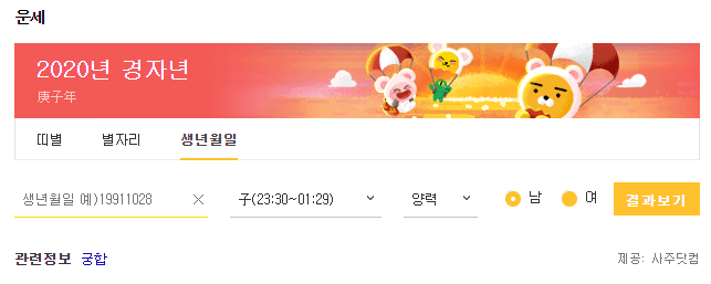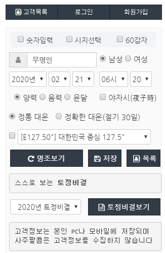 사용방법은 똑같습니다. 생년월일 태어난시간 양음력 성별을 선택하고 결과를 보면 됩니다.