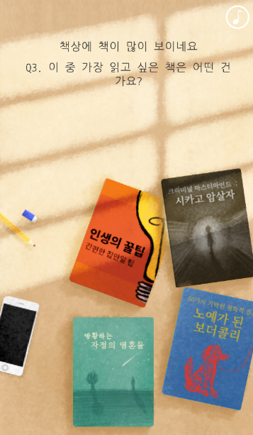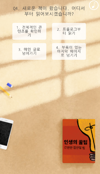 3번은 4가지 중에서 어떤책을 읽고 싶은지 물어본다. 보기는 인생의꿀팁, 시카고 암살자, 방황하는 자정의 영혼들, 노예가 된 보더콜리가 나온다. 필자는 인생의 꿀팁을 눌렀다.