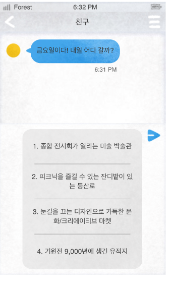 7번은 친구와의 약속을 잡는다. 종합전시회가 열리는 미술 박술관, 피크닉을 즐기수있는 등산로, 문화/크리에이티브마켓, 유적지 등이다. 나는 2번을 선택
