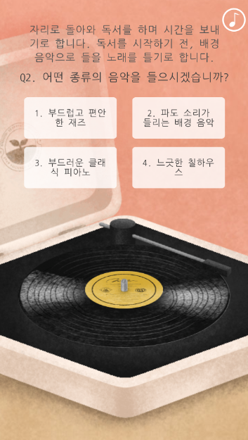 2번 문제는 어떤 종류의 음악을 들을건지 물어본다.