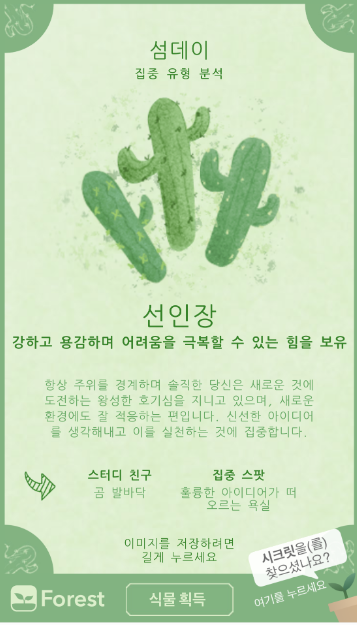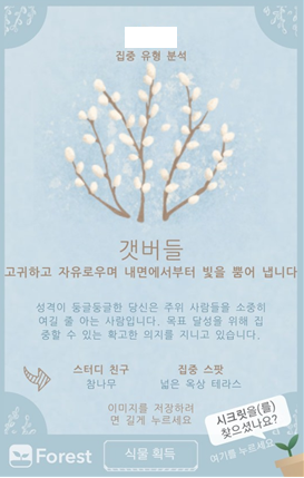 몰입감이 꽤 있는편이기도했고, 이속에서 나의 지문에 따라서 자신의 공부유형등을 식물이나 꽃으로 결과가 나온다.