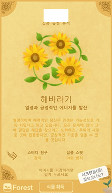조금씩 집중력타입이 다르다. 내친구들은 대부분 해바라기가 다수가 나왔고 그다음은 야자수 나무가 높은 비율로 나왔다. 포레스트 심리테스트 결과를 좀더 찾아봤는데 후기를보니 벚꽃, 카네이션, 장미, 대나무등 재밌는 결과가 많았다.