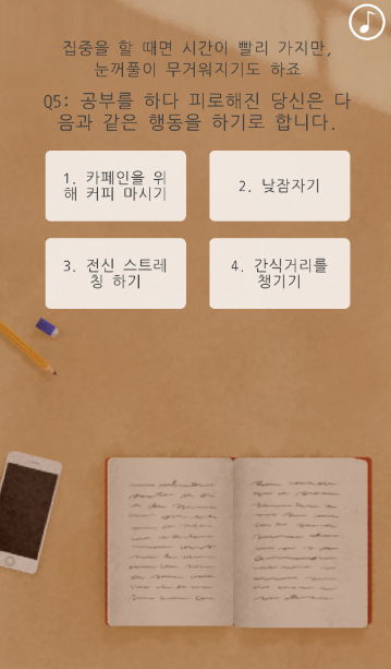 5번은 공부를하다가 피로해진 당신이 어떻게 행동을 하는지 묻는다. 나는 3번 정신 스트레칭 하기를 골랐다.
