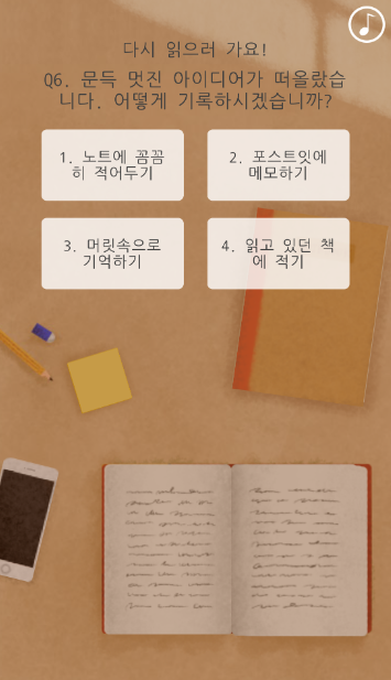 6번은 멋진아이디어가 떠올랐을때 어떻게 기록하는지 묻는다. 나는 1번을 선택했다.