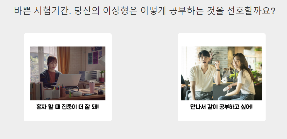 fonfon(폰폰) 이상형 테스트의 6번질문이 좀 재밌었어요. 바쁜 시험기간, 나의 이상형은 어떠헥 공부하는걸 선호할지 물어보네요. 개인적으로는 연애하면서 대부분이 2번이었는데 이러면 필자는 기본적으로 시험에 망했고요. 상대도 대부분망했습니다. 1번을 눌렀습니다. 항상 사람은 결과가 중요하기 때문에..