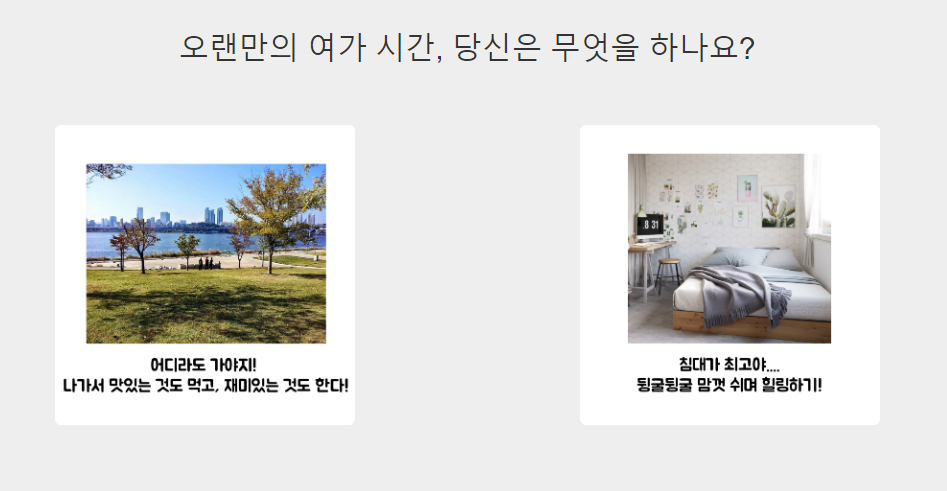 개인적으로 실내나 실외에서 노는걸 모두 좋아하나. 그래도 활동적인게 좋다고 생각해서 1번은 선택해보았어요.