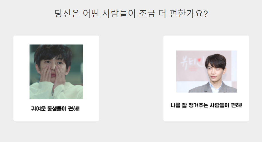 fonfon(폰폰) 이상형 테스트 - 나 만들기! 5번질문 어떤사람이 더 편한지 물어보는데 아마도 어떤쪽에 호감이 더가는지 물어보는것 같아요. 개인적으로는 연하는 안좋아해서 2번을 눌렀습니다. 잘챙겨주는게 편했던것 같아요. 성향마다 차이가 있는데 챙겨주는걸 좋아하는 사람이라면 1번을 누르겠죠.