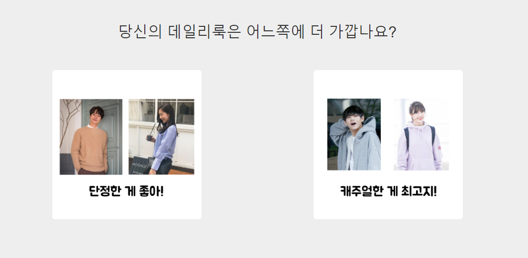 2번질문은 나의 룩을 물어봅니다. 위의 이상형 테스트를 할때와 비슷한 전개로 이어지는것 같습니다.