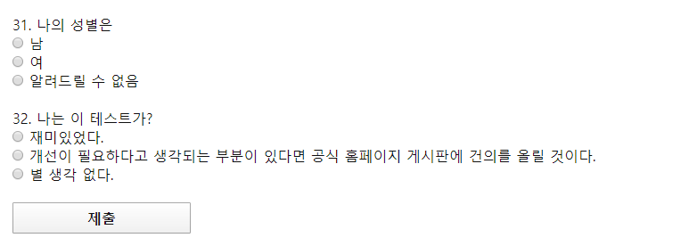 정신연령테스트의 질문은 실질적으로는 30문제고 마지막 두문제는 성별과 이테스트에 대한 생각을 작성하는것으로 완료가됩니다.