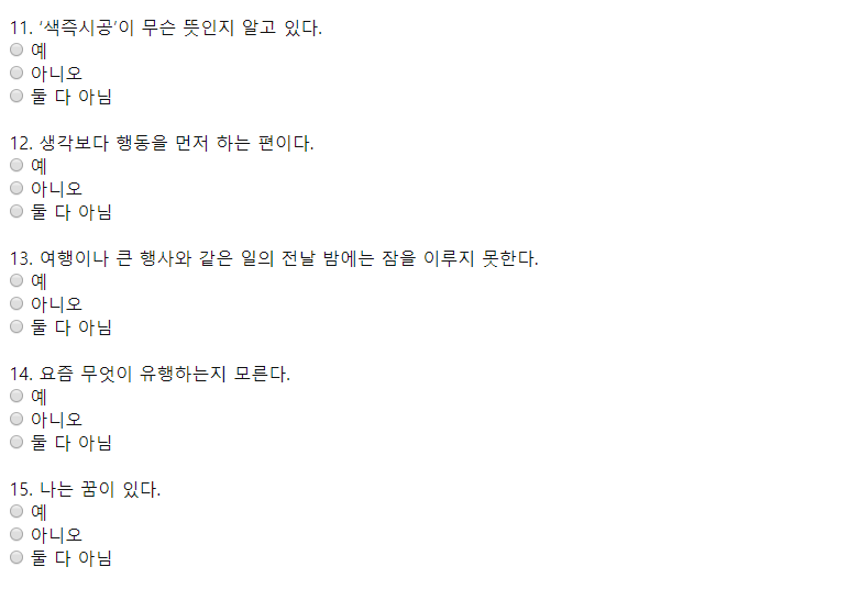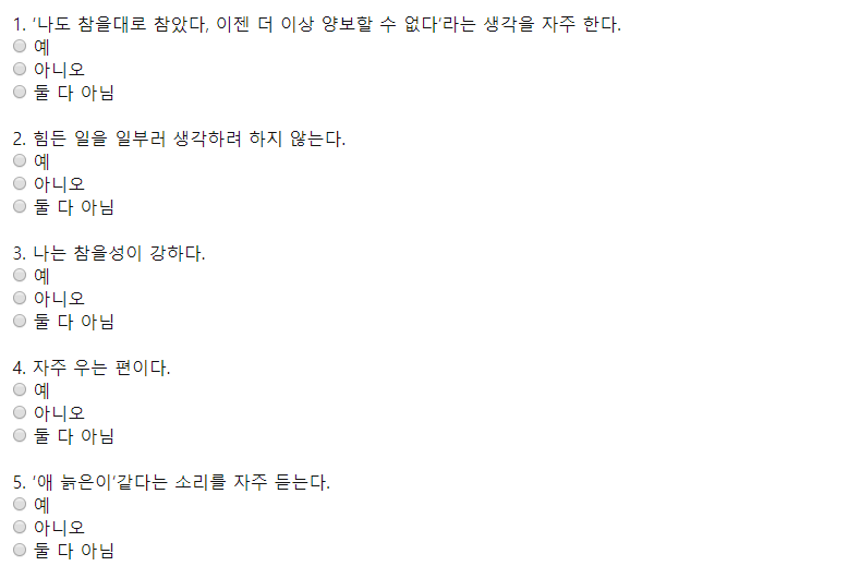 각문제마다 예, 아니오, 둘다아님 3지선택지중 하나를 골라주시면 됩니다.