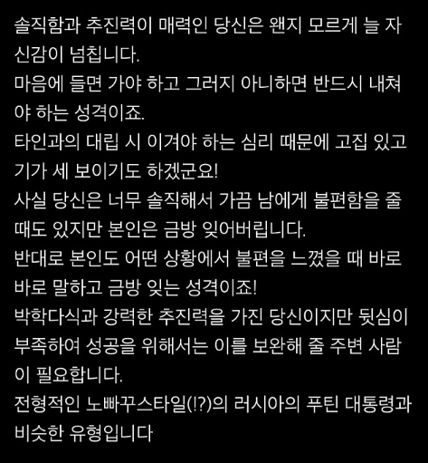 솔직함과 추진력이 매력적인 사람으로 왠지 모르게 자신감이 넘쳐있다고 합니다.