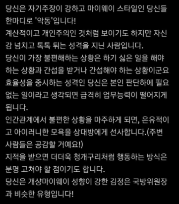 부지런하며 능력이 있지만 말투가 직설적이라 딱딱하다는 소리를 듣습니다.