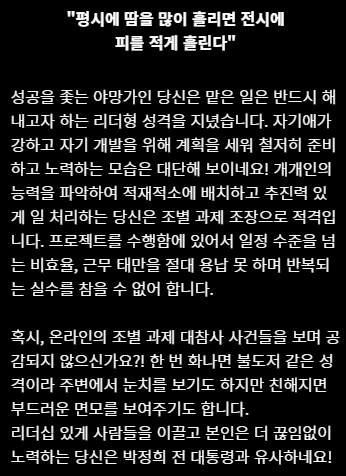 업무능력이 탁월하며 조직에 적응을 잘합니다. 목표를 세우고 부지런한 스타일이라고 합니다.