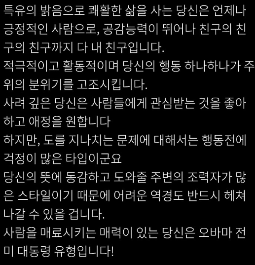 특유의 밝음으로 쾌할한 삶을 사는 당신은 언제나 긍정적인 사람으로 공감능력이 뛰어나 친구의 친구의 친구까지 다 내친구가 되는 스타일 사려가 깊고 관심받는 것을 좋아하고 애정을 원한다고 합니다. 도가 지나치게 행동전에 걱정이 많은 스타일이라고 합니다.