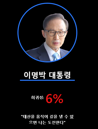 이명박 - 희귀성 6% "태산을 움직여 길을 낼 수 있으면 나는 도전한다."