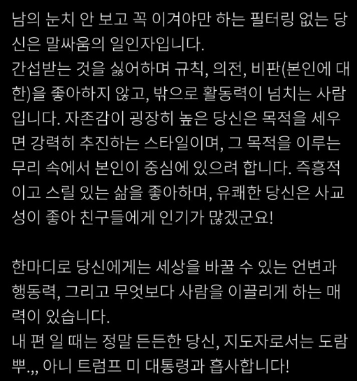 눈치를 보지않는 성격으로 필더링이 없는 당신은 말싸움의 일인자라고 하네요. 간섭을 받는것을 싫어하고 규칙 의전 비판을 좋아하지 않으며 밖으로 활동력이 넘치는 사람이라고 합니다. 자존감이 매우높으며 목적을 세우고 강력하게 추진을 한다고 합니다. 즉흥적있고 스릴있는 삶을 좋아한다고 합니다.