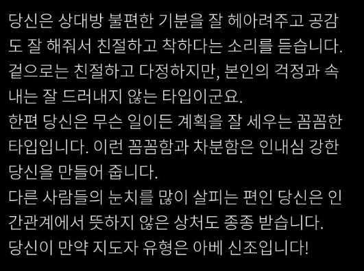 어떤일이던 계획을 잘세우고 꼼꼼하며 다른 사람들의 눈치를 많이 본다고 합니다.