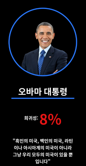 오바마 - 희귀성 8% "흑인의 미국, 백인의 미국, 라틴이나 아시아계의 미국이 아니라 그냥 우리 모두의 미국이 있을 뿐입니다."