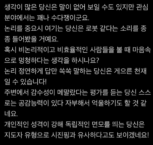 놀리 정연하고 답만 쏙쏙 말하는 당신은 게으른 천재라고 하네요. 개인적인 성격이 강해 독립적인 면모가 있다고 합니다.