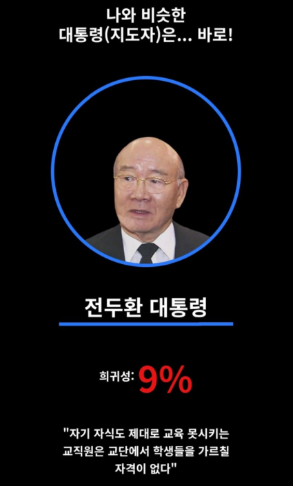 전두환 - 희귀성 9% "자기 자식도 제대로 교육 못시키는 교직원은 교단에서 학생들을 가르칠 자격이 없다."