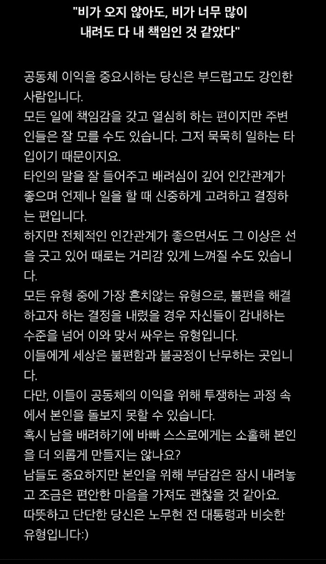 노무현 - 희귀성 4% "비가 오지 않아도, 비가 너무 많이내려도 다 내 책임인 것 같았다.