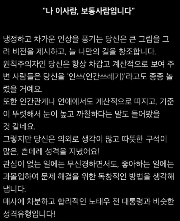 결과값을 쭉 보니 ISTJ는 이명박, ISFJ 아베, ISTP 김정은, ISFP 박근혜, INTJ 노태우, INFJ 노무현