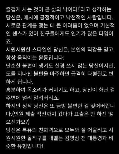 눈치를 보지않는 성격으로 필더링이 없는 당신은 말싸움의 일인자라고 하네요. 간섭을 받는것을 싫어하고 규칙 의전 비판을 좋아하지 않으며 밖으로 활동력이 넘치는 사람이라고 합니다. 자존감이 매우높으며 목적을 세우고 강력하게 추진을 한다고 합니다. 즉흥적있고 스릴있는 삶을 좋아한다고 합니다.