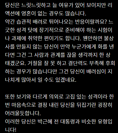 느긋한 성격탓에 장기적인 시험이나 과제에 약하다고합니다. 보기와 다르게 의외로 고집이 있고 한번 마음속에 결정 내린 당신을 뒤집기는 어렵다고 하네요.