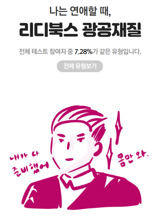 필자의 경우는 7.28%가 나온 리디북스 광공재질형이 나왔으며, 외향적이고 능동적이고 이타적이라는점을 알 수 있었습니다. 능력치 강화 TIP을 보니 평소 대화를 기억하라는 조언이 남겨져있었는데, 약간 내말만하는 스타일이었는데, 이점을 보완하면 좋을것 같다는 생각을 했습니다. (자아성찰의 시간이었습니다.ㅋ)