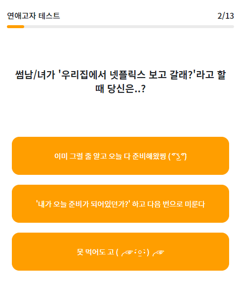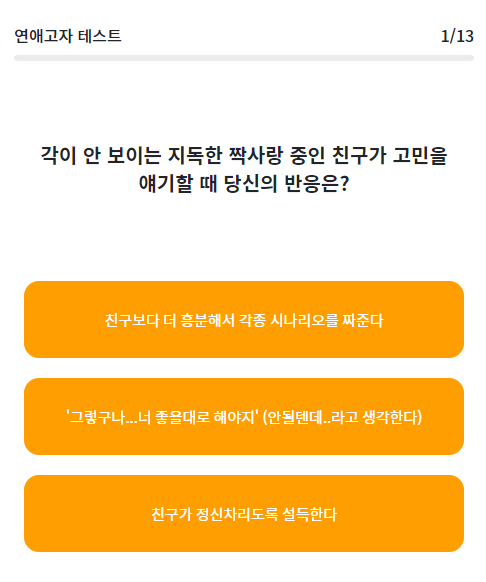연애고자 테스트는 총 13문항으로 2~4개의 보기로 이루어져있습니다.