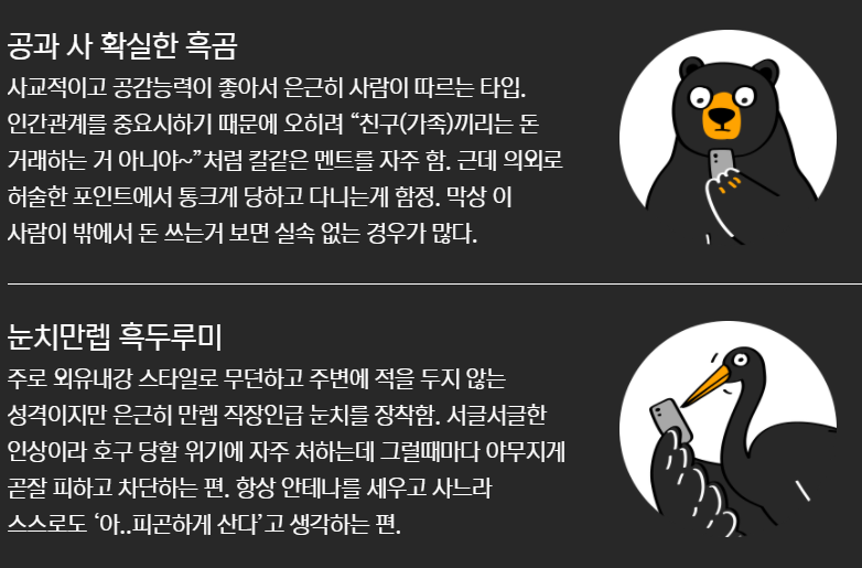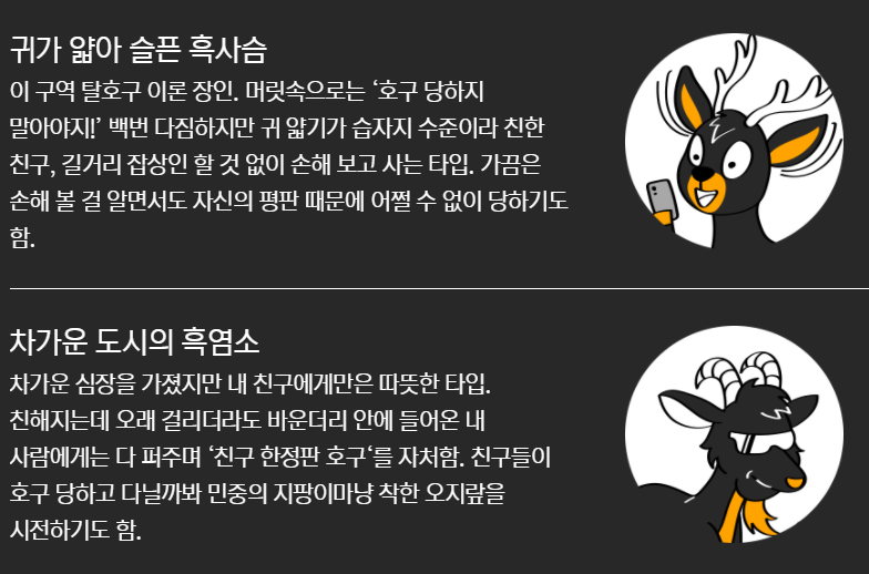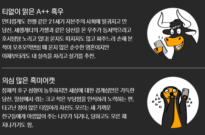 필자의 경우는 차가운 도시의 흑염소의 타입이 나왔으며, 성향과 많이 비슷하다고 생각을 했습니다.