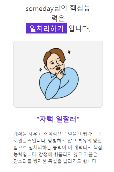 12문항을 모두 풀고 필자의 능력을 분석을 했습니다. 필자의 핵심 능력은 일처리하기이고 일명 자뻑 일잘러로 나왔습니다. 이것도 어느정도 신빙성이 있게 비슷한 기질에 맞게 나왔다고 생각이 들었네요.