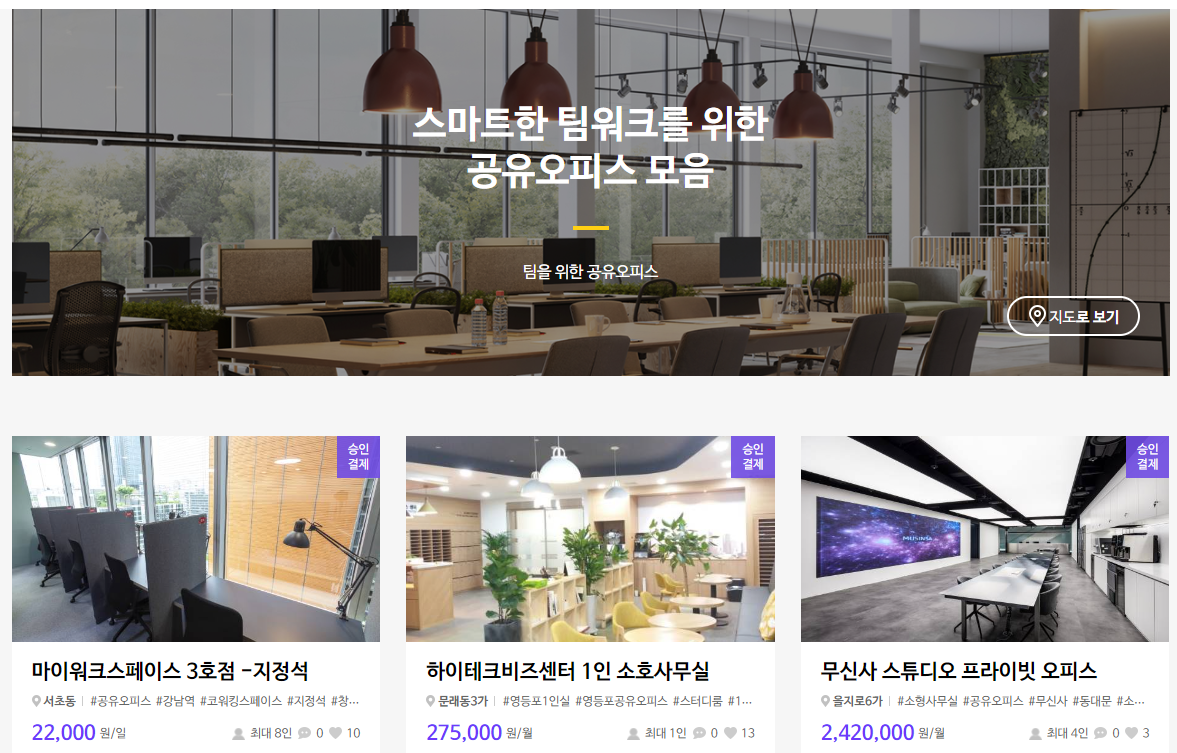 여러 공유 오피스들이 나왔고.. 왠지 가고싶다는 생각도 들긴했네요. 역시 지정석은 조금 싸고 1인은 매우 비싸다고 생각이 들긴 했는데.. ㅋㅋ 나중에 성공을하면 개인적인 오피스를 차리는걸로 생각을하고 마무리를 했습니다.
