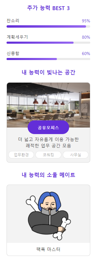 또 내 능력이 빛나는 공간은 공유 오피스가 나왔고 소울 메이트는 팩폭 마스터가 나왔네요. 필자가 팩폭마스터가 나왔어도 비슷하긴 했을것 같다고 느꼈습니다.
