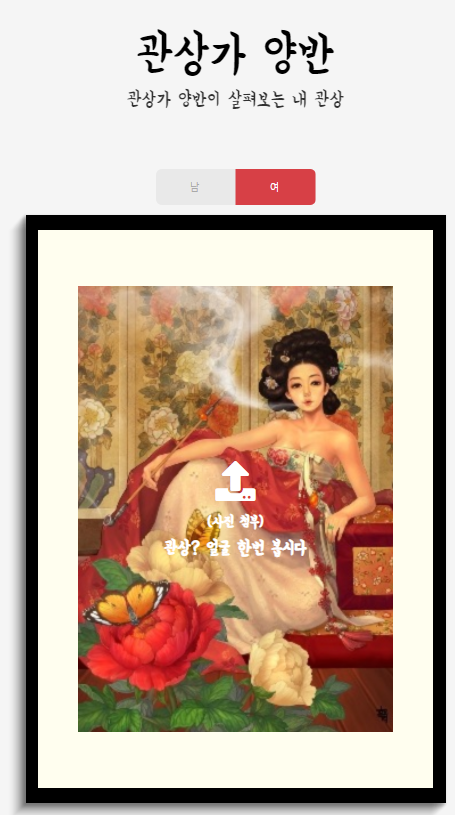 위의 페이지에 들어오면 나오는 메인화면입니다. 남자는 남, 여성은 여를 클릭한후 자신의 사진을 첨부를 해줍니다.