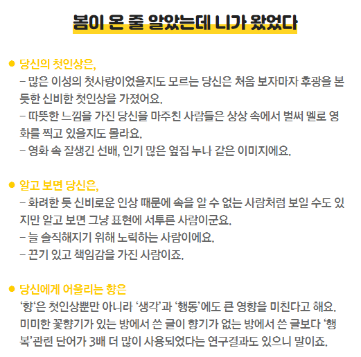 주어진 문제를 풀고 나에게 맞는 유형이 결과로 나오며 나의 첫인상 및 어울리는 향 알게되었을때의 나에 대해서 자세한 설명과 함께 향수를 추천을 해줍니다.