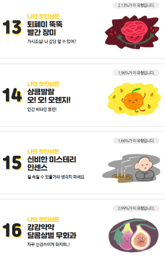 결과론적으로는 16개의 유형이 나와서 MBTI와 관계가 있을까 생각도 했지만 테스트를 풀면서 그런느낌은 받지는 못했습니다.