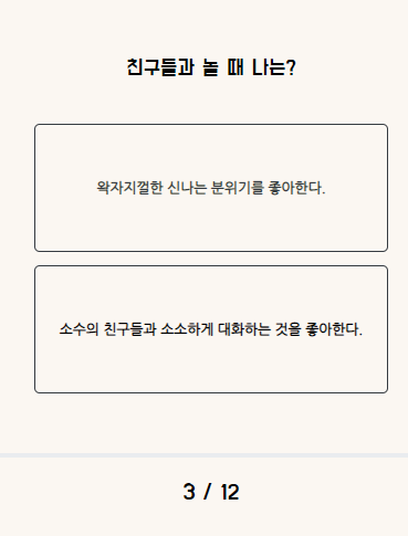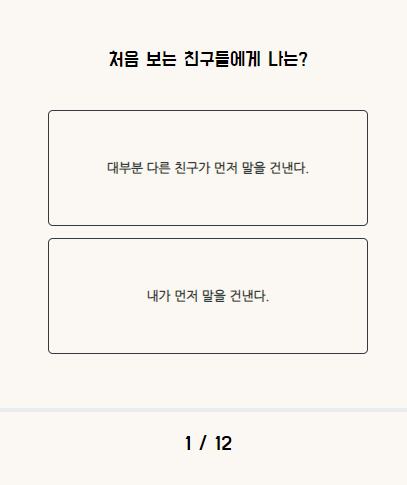 여러 심리테스트들의 문항과 비슷하다는 생각이 먼저 들었고, 아마도 결과도 비슷하게 나오지 않을까 추론을하면서 원래 성격대로 12문항을 모두 풀었습니다.