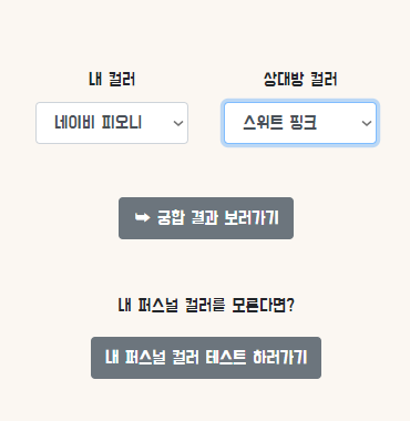 사이트로 들어가서 궁합 보러가기를 누르고 내컬러와 상대방 컬러를 눌러서 선택을 해주고 궁합 결과를 볼 수 있음.