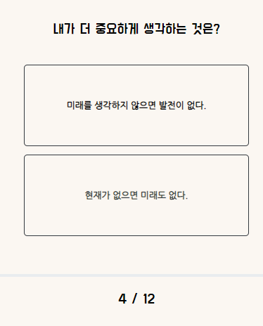 여러 심리테스트들의 문항과 비슷하다는 생각이 먼저 들었고, 아마도 결과도 비슷하게 나오지 않을까 추론을하면서 원래 성격대로 12문항을 모두 풀었습니다.