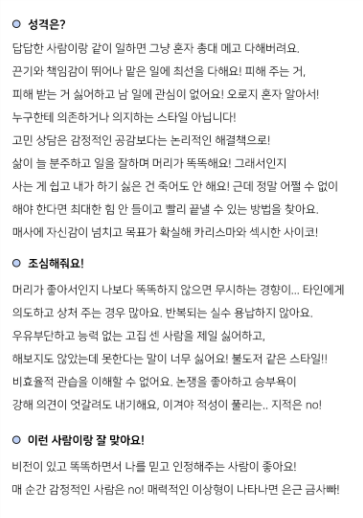 두번째는 조심할점으로, 남을 무시하는 경향이 있고 타인에게 의도하지 않고 상처주는 경우가 많다고 주의점을 줍니다.