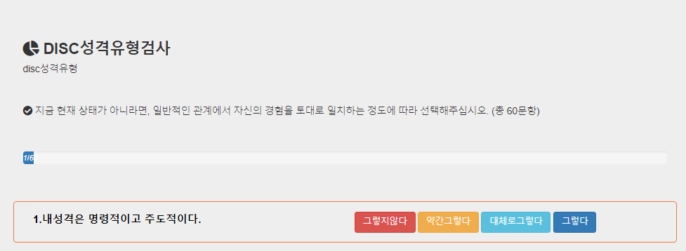 문항은 총 60문항으로 4지선다로 나옵니다. 문항은 주로 어떤 행동을 하는지에 대해서 나와있으며, 그렇지 않다, 약간 그렇다, 대체로 그렇다, 그렇다로 선택을 해주시면 됩니다. 아마도 각각의 선택한 보기를 통해 D,I,S,C의 성향을 판단하는 것 같습니다. 위의 설명대로 일관성있게 내가 평소하는 행동을 선택해주시면 될 것 같아요.