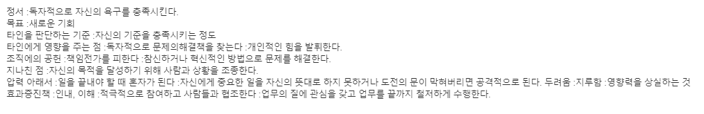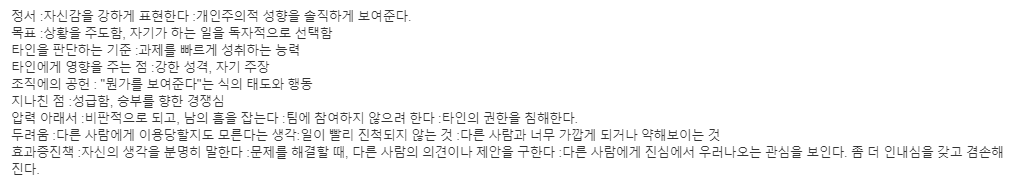 필자의 경우는 앞도적으로 D주도형의 점수가 높았습니다. 나머지는 40점 이하로 전체적으로 낮게 나왔습니다.
