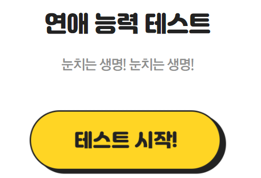 연애 능력 테스트 후기 (방구석연구소) intro 비밀 댓글로 추천을 해주신 연애 능력치 테스트 후기를 작성을 합니다. 지금까지 작성을 했던 다양한 성격 이론들 (MBTI, 애니어그램)과는 전혀 무관합니다. 총 참여자수가 3511315명으로 약 350만명이 응시를 하였는데, 그만큼 ? 신뢰도가 있다고 생각을 합니다. 연애 능력 테스트 눈치는 생명! 눈치는 생명! www.banggooso.com 방구석 연구소 사이트에서 테스트 진행이 가능합니다. 테스트 시작 해당 링크에서 연애 능력 테스트 시작을 통해서 시작을 합니다. 문제는 총 13문항이며 보기는 3가지로 나뉩니다. 자신의 성향에 맞게 눌러주는게 검사 결과가 정확하게 나올것 같습니다. 필자는 MBTI는 ESTJ 애니어그램은 8번인데, 결과를 보고 어느정..