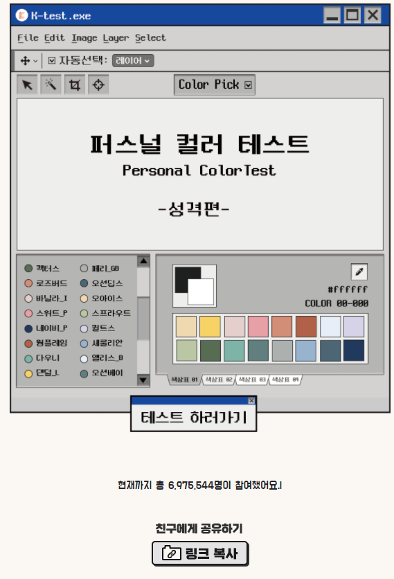 퍼스널 컬러 & 궁합 테스트 주소 링크 후기 intro 이번시간 작성할 주제는 퍼스널 컬러 테스트입니다. 12문항으로 구성된 2지선다의 문제를 풀고 나의 퍼스털 컬러를 알 수가 있습니다. 또 나온 나의 색과 상대의 색을 통해서 궁합을 확인 할 수 있습니다. 퍼스널 컬러 테스트 링크 주소 kapable.github.io/kapable.github.io/personalColor/ 시작 실검에 한번 올라온적이 있어서 그런지 꽤 많은 약 700만명정도가 참여를 하였습니다. 나오는 색깔은 위에 보이는 총 16가지 중 하나로 나오는것 같습니다. 16가지라고 하니까 역시 mbti가 먼저 떠오르네요. 과정 퍼스널 컬러 테스트의 대략적으로 질문을 통해서 나의 성향을 묻는것을 알 수 있었습니다. 여러 심리테스트들의 문항과..